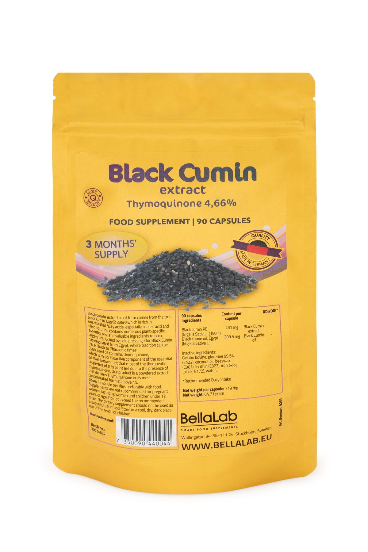 L'olio estratto al freddo contiene i semi neri, ed è stato iniziato ad essere usato in Egitto Antico, mentre nei secoli successivi è arrivato e diventato popolare in Asia e Europa per i benefici alla salute. L'olio estratto a freddo contiene timochinone - un composto bioattivo che è il principale componente biologicamente attivo dell'olio essenziale. I timochinoni sono antiossidanti naturali e hanno proprietà antinfiammatorie e antimicrobiche. L'integratore alimentare di cumino nero Thymoquinone BCE ha una concentrazione del 4,66%, da 5 a 10 volte superiore alla concentrazione dell'olio normalmente estratto.